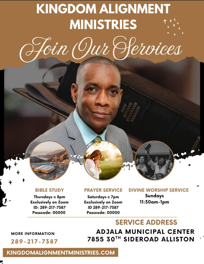 Kingdom Alignment Ministries is a Pentecostal church dedicated to preaching and teaching the revelatory knowledge of God throughout the nations. Our vibrant community of Spirit-filled believers transcends age, gender, race, and nationality, united by a commitment to advancing the gospel of Jesus Christ. Kingdom Alignment Ministries provides a comprehensive range of services to foster spiritual growth, community development, and Kingdom impact: Dynamic Worship Services, Spirit-led worship experiences that inspire and uplift; Biblical Teaching and Preaching, revelatory sermons rooted in Scripture to equip believers; Prayer and Deliverance Ministry, spiritual warfare, healing, and deliverance for individuals and families.